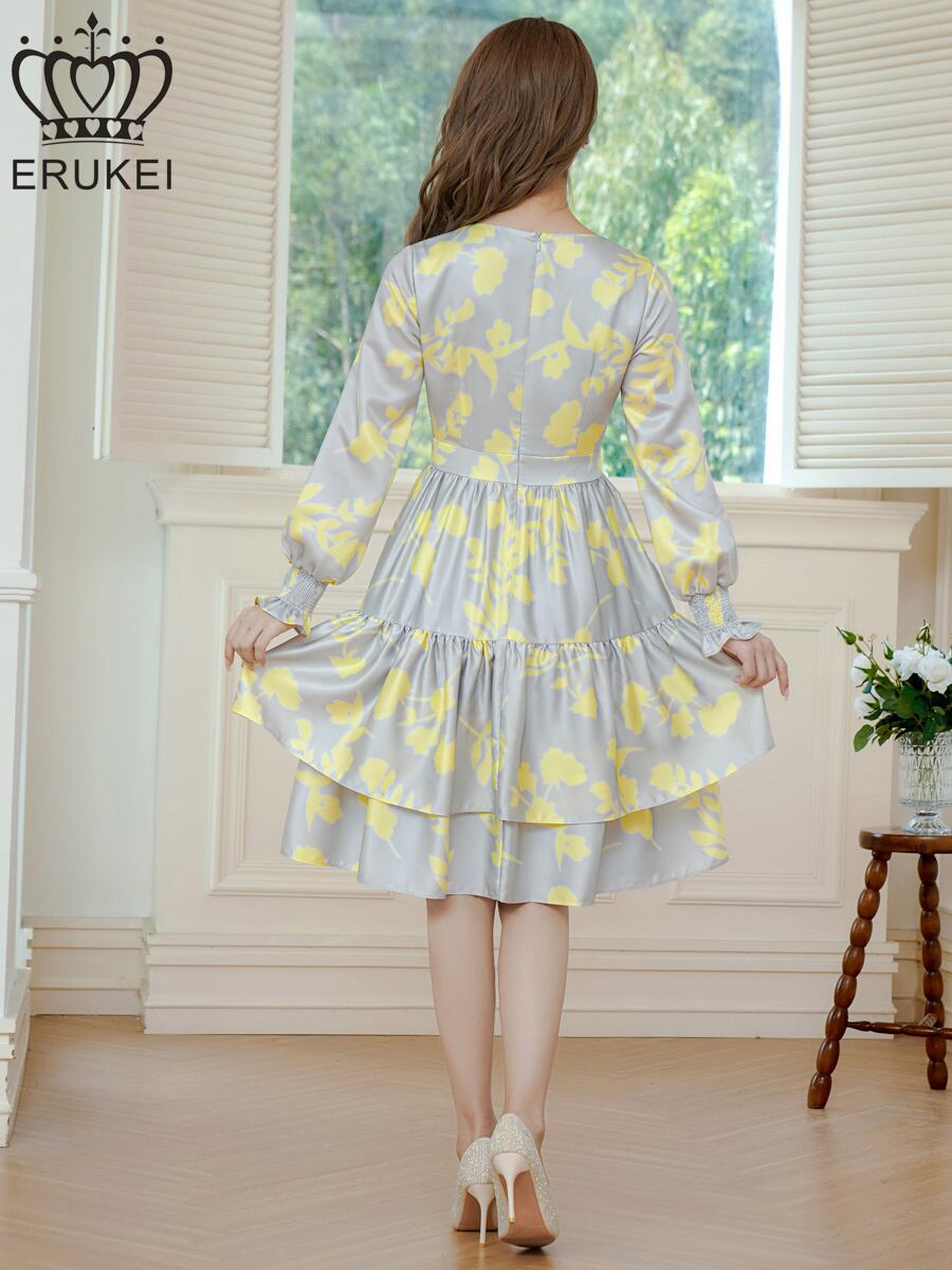 ERUKEI【エルケイ】ペイント柄・花柄・サテン・Vネック・長袖・ティアード・Aライン・膝丈・ミディアムドレス【E33147】