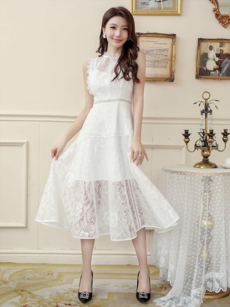 ERUKEI【エルケイ】総レース・プチハイネック・ノースリーブ・Aライン・ミディアムドレス【E2603】