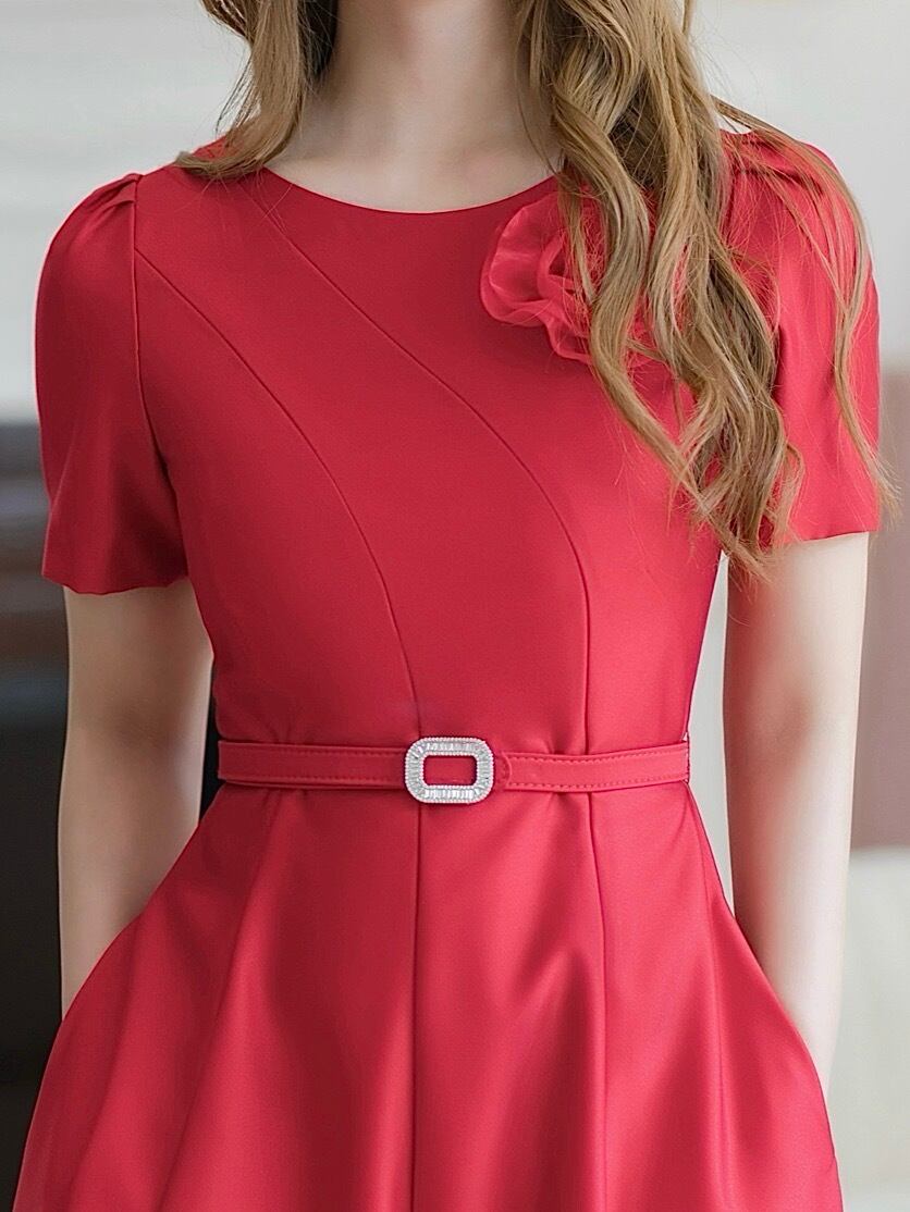 ERUKEI【エルケイ】半袖・シンプル・コサージュ・Aライン・ミディアムドレス【C2741】