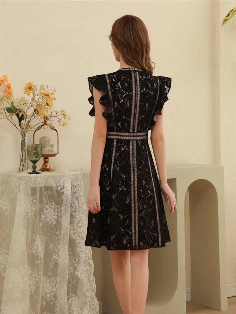 ERUKEI【エルケイ】総レース・Vネック・フリル・ハイウエスト・Aライン・ショート丈・ミニドレス【S32088M】