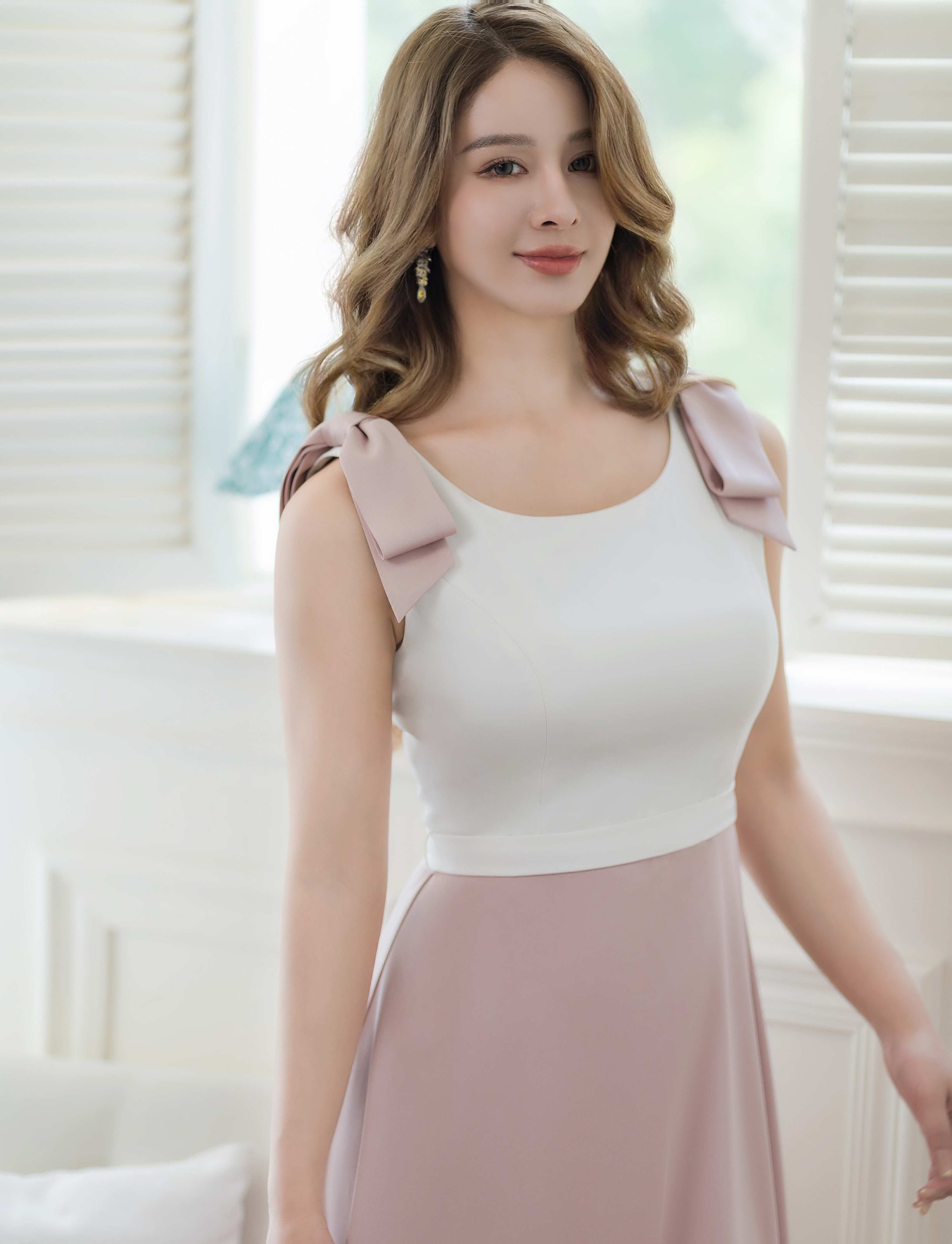 ERUKEI【エルケイ】肩リボン・ノースリーブ・Aライン・ハイウエスト・ミディアムドレス【C23067】
