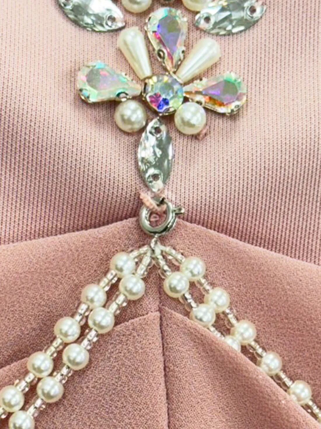 胸元にあしらわれた煌めくビジューが、華やかでリュクスな印象を演出。