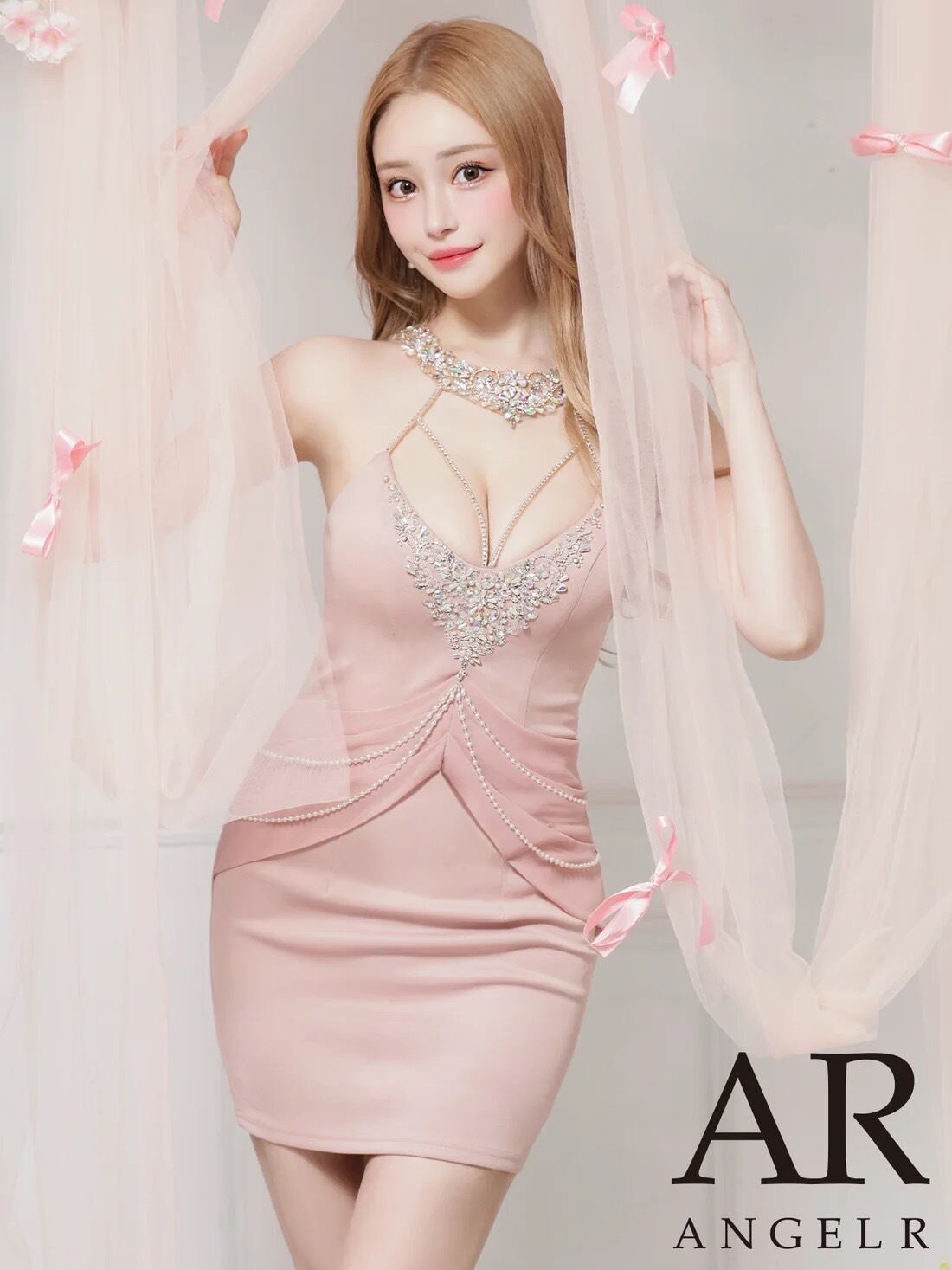 【Angel R】ホルターネック/ビジュー/シフォンドレープ/パールチェーン/タイトミニドレス(AR25230)
