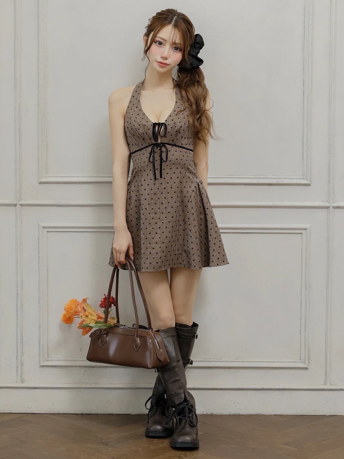 デコルテを美しく魅せるホルターネックと、レースアップのディテールが女性らしさを引き立てる一着。