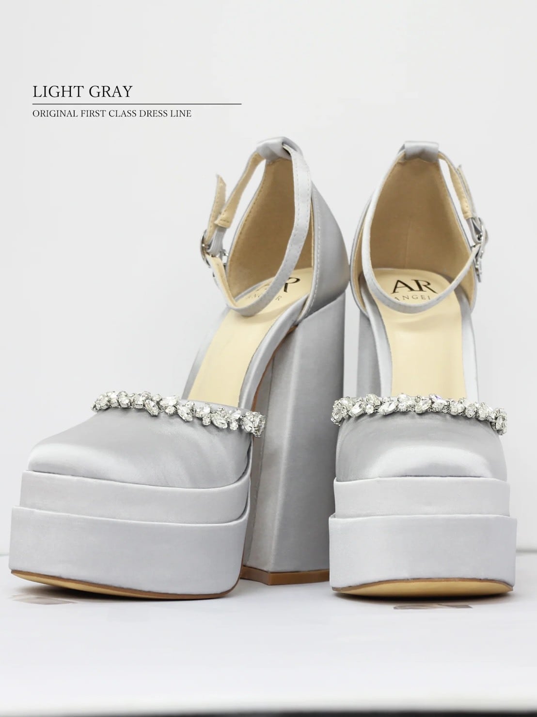 甲にあしらったビジューラインが輝く、サテン素材のラグジュアリープラットフォームパンプス。