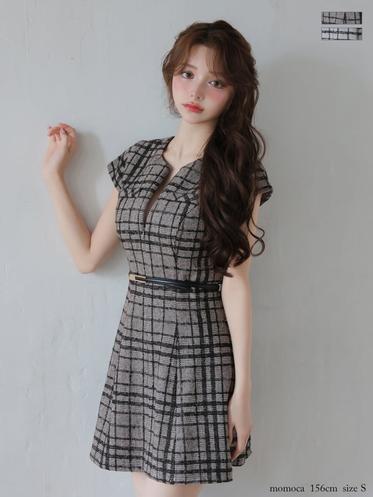 チェックツイード袖付きプリーツスカートミニキャバドレス(DE4330)