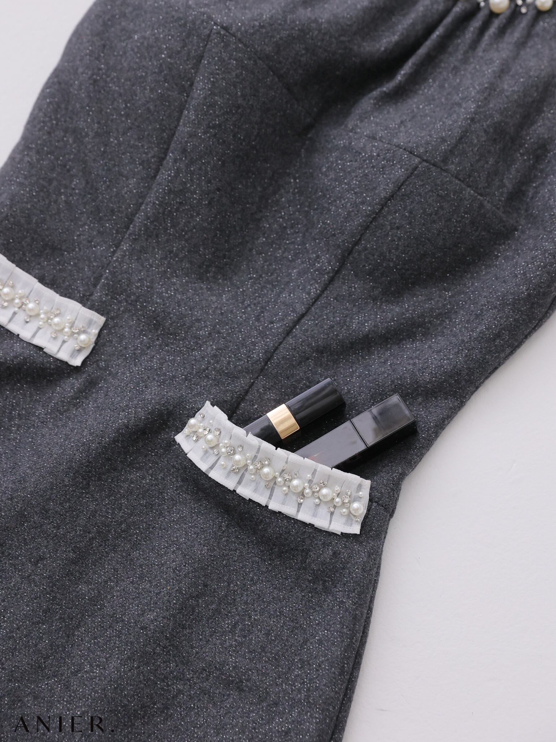 グレー生地にパールを乗せて、上品×ガーリーなワンピースを作りました。