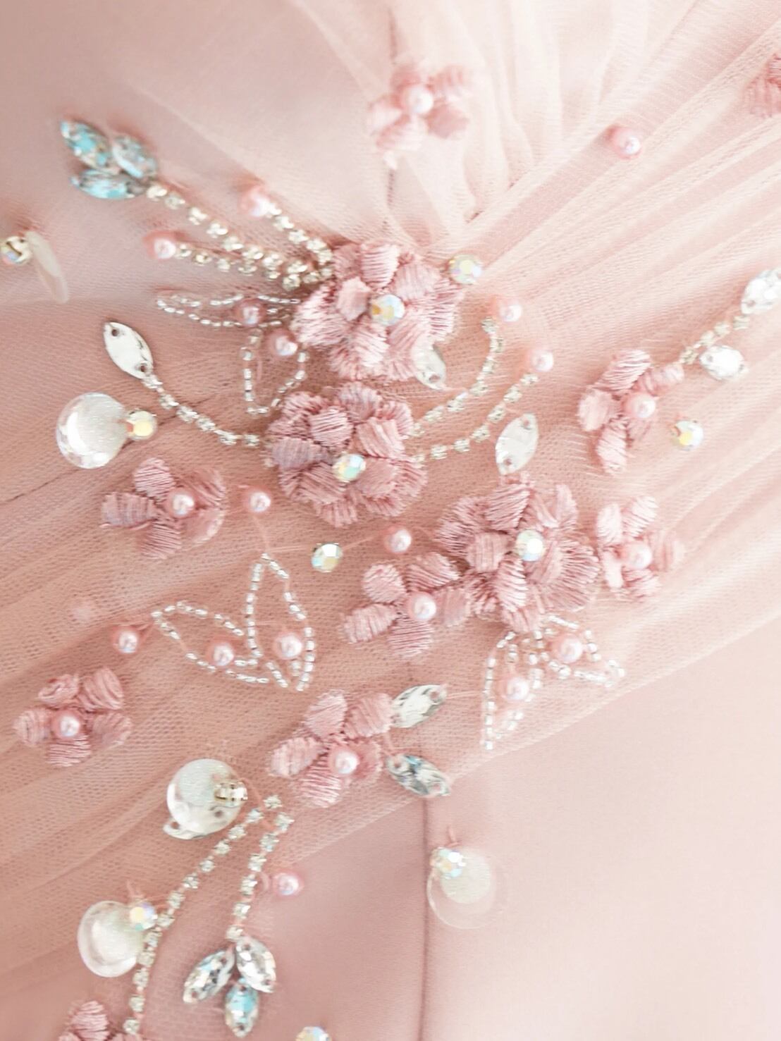 透け感のあるチュールとビジュー刺繍を重ね、軽さと華やかさのバランスを追求しました。