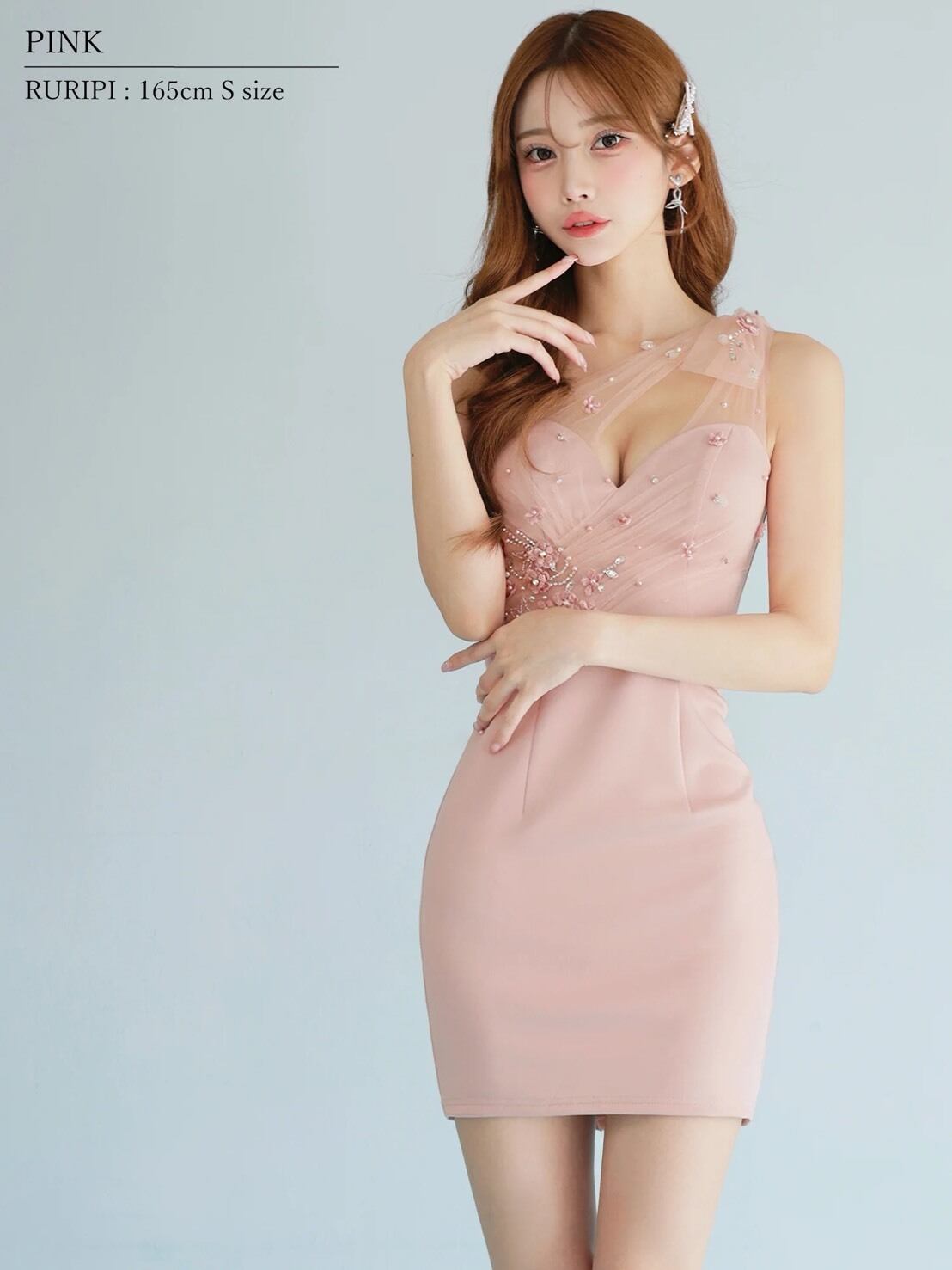 【Angel R】ワンショルダー/リボン/メッシュ/ビジュー/フラワー/タイトミニドレス(AR26204)