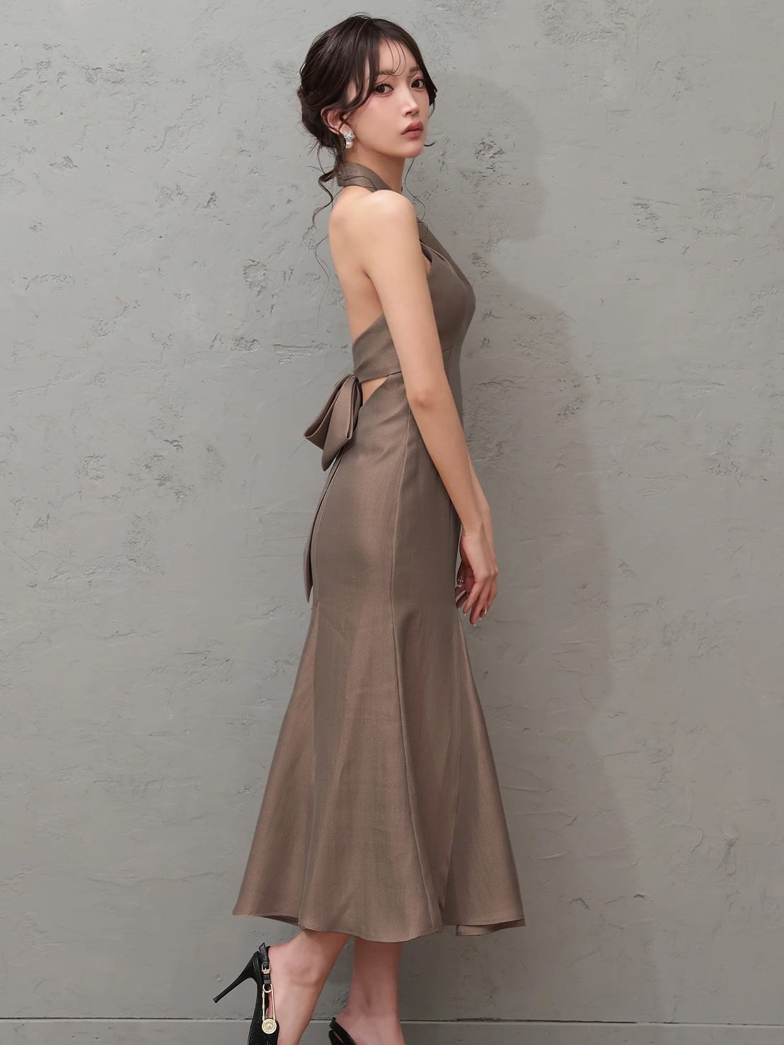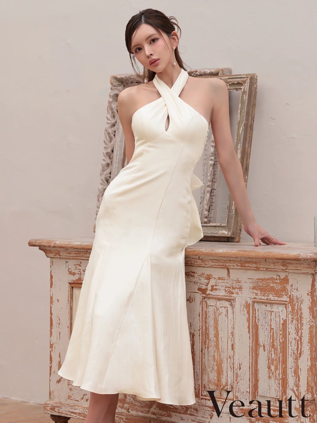 首元でクロスするホルターネックデザインが、洗練された印象を与えるロングドレス。