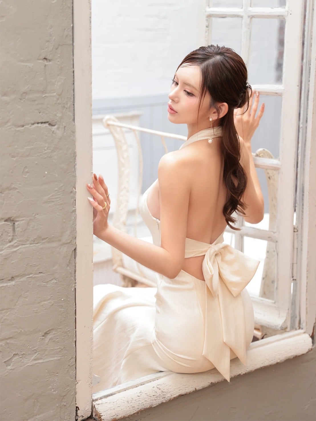 背中は大胆に開いたバックスタイルに、リボンディテールを添えて後ろ姿まで美しく演出。