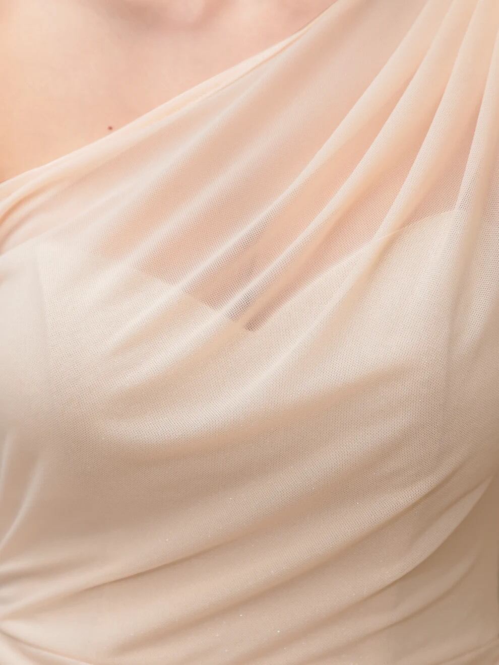 ワンショルダーのアシンメトリーデザインがデコルテを美しく引き立てる、洗練された一着。