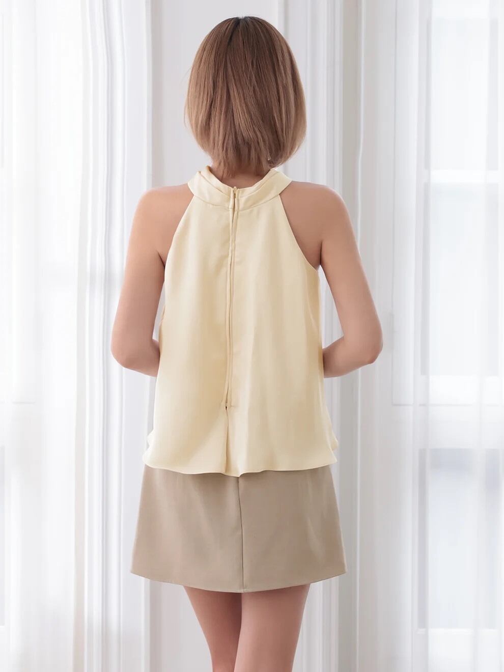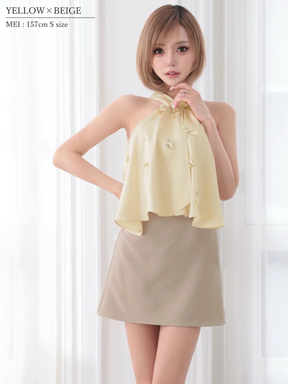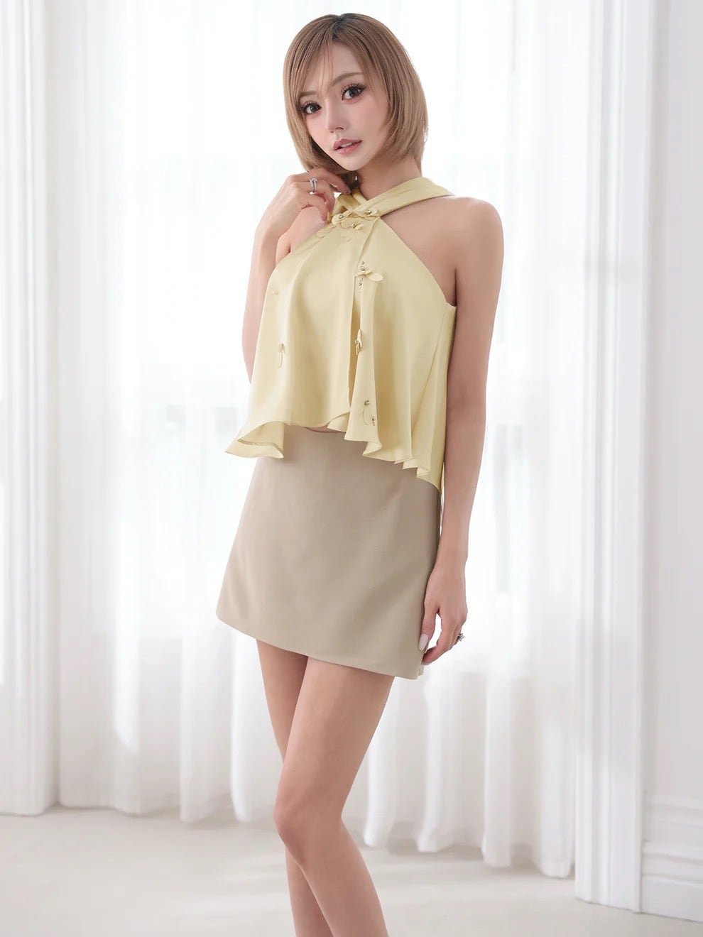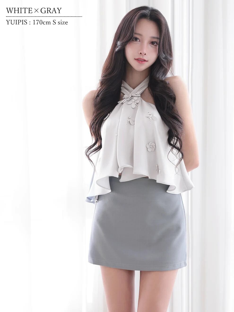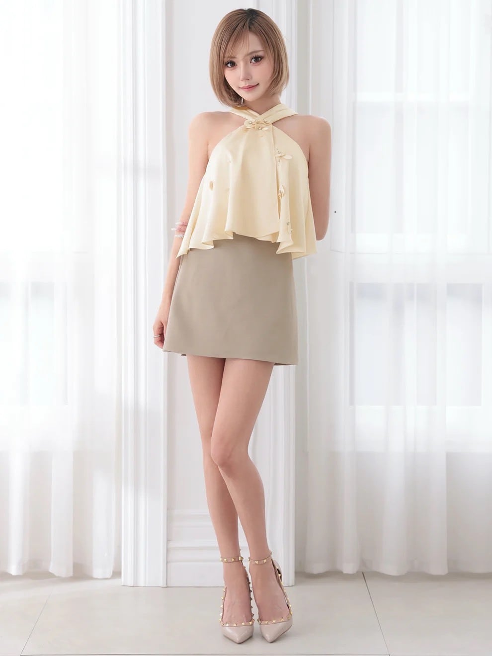 首元のクロスホルターデザインがデコルテを美しく引き立て、ふんわり広がるトップスが女性らしい柔らかさを演出します。