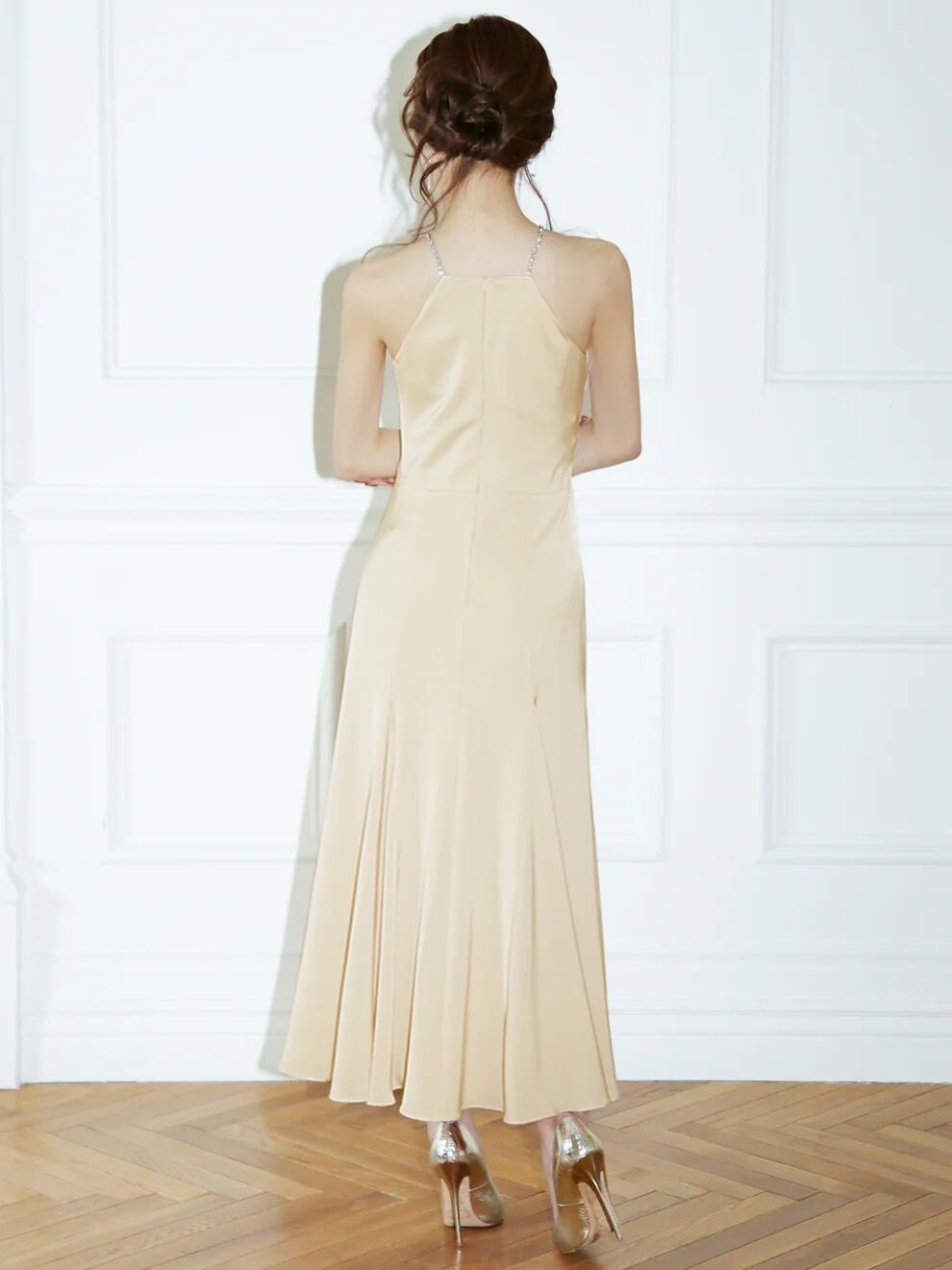 首元の華奢なストラップがデコルテを引き立て、女性らしいラインを演出します。