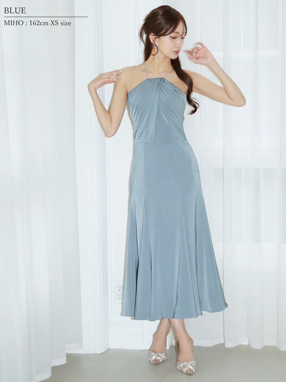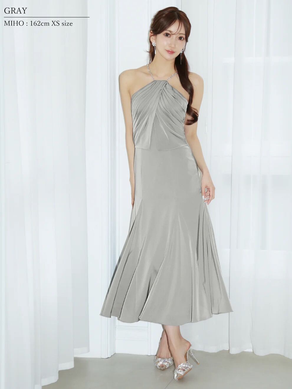 繊細なプリーツとドレープが美しく重なる、上品なホルターネックドレス。