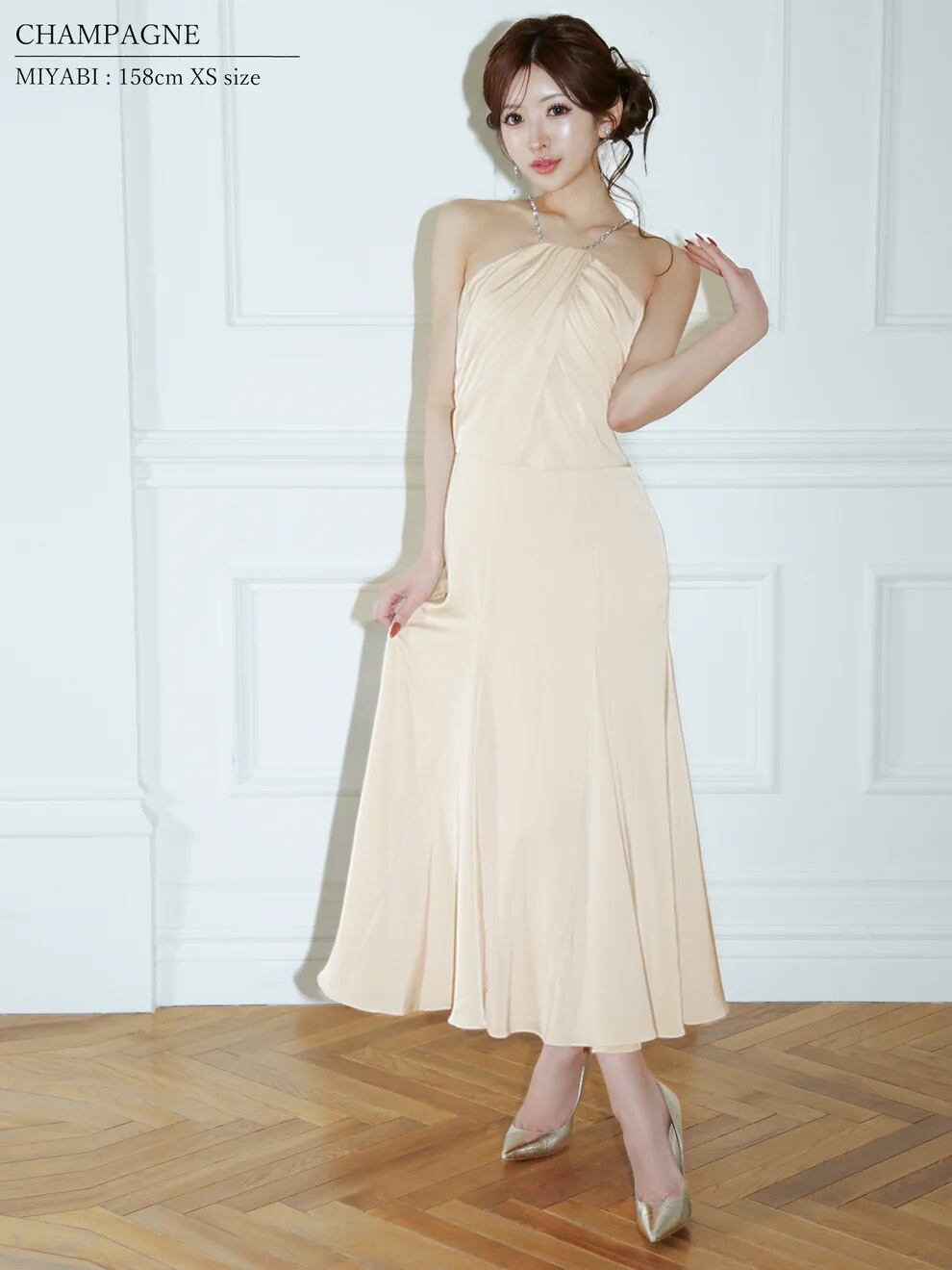 【Angel R-Veautt】(ヴュート)ホルターネック/ビジューチェーン/ドレープ/フレア/ミディアムドレス(VT082611)