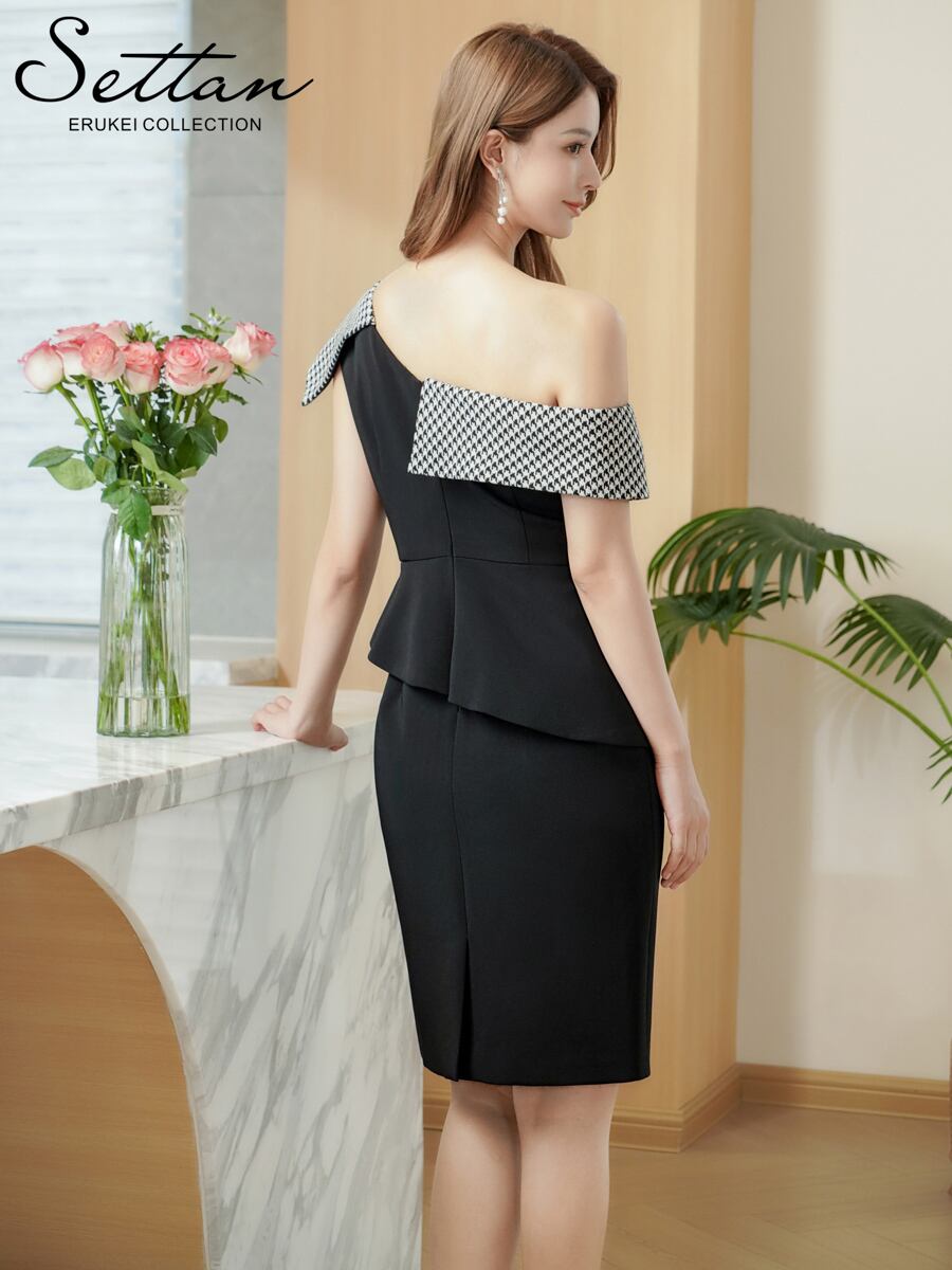 ERUKEI【エルケイ】千鳥格子柄・モノトーン・ビジューボタン・ワンショルダー・オフショルダー・タイト・ミ二ドレス【S25277】