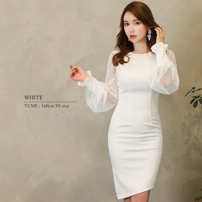モダンテイストながらもデザイン性のある袖メッシュが大人フェミニンな雰囲気を奏でるタイトドレス。