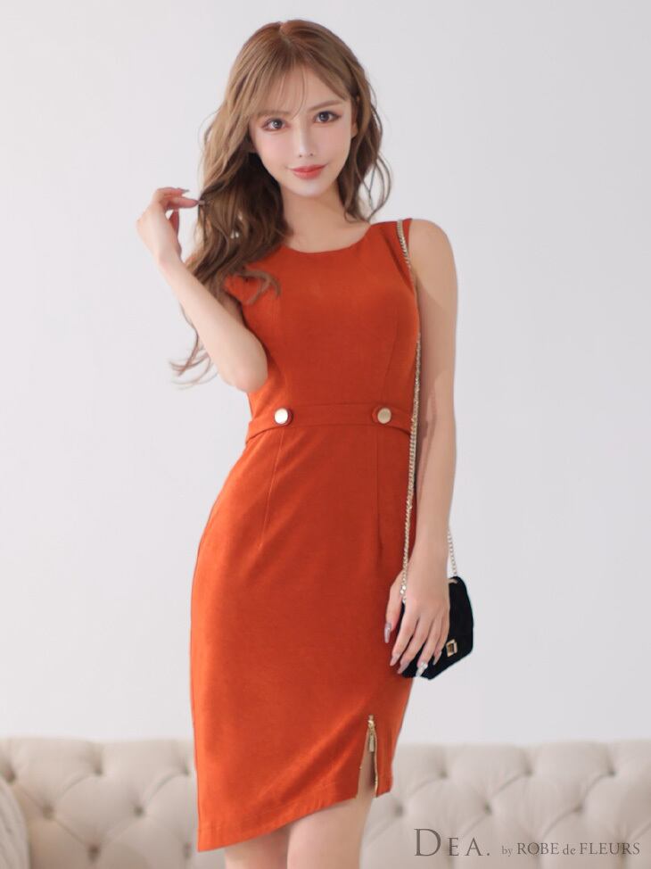 スエード生地を使用したアシンメトリーデザインが印象的なタイトドレス。